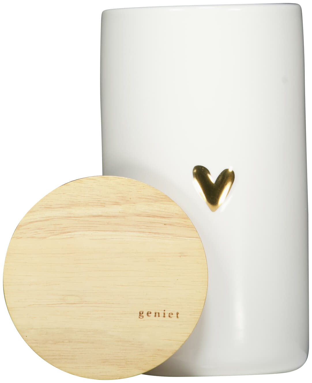 De voorraadpot met deksel van Zusss is een minimalistische accessoire met een stijlvol hartjespatroon. De pot combineert elegant wit met een gouden accent voor een verfijnde uitstraling. Perfect voor het opbergen van kleine items met een vleugje charme.